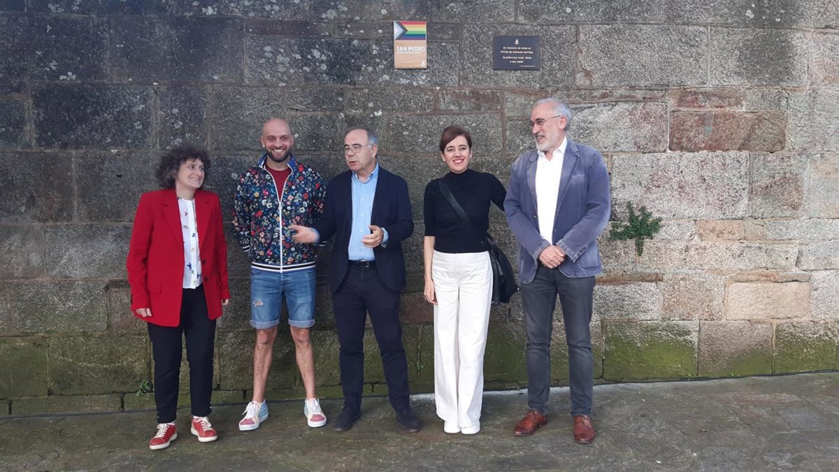 La insignia, que luce la bandera arcoíris, ha sido descubierta por el alcalde de la ciudad, Xosé Sánchez Bugallo, y por Santiago Abal, impulsor de la propuesta. Al acto también han acudido los portavoces de los grupos del PSdeG, Sindo Guinarte, de Compostela Aberta, Marta Lois, y BNG, Goretti Sanmartín, pero no del PP.