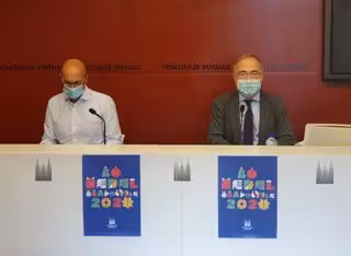 El alcalde de Santiago, Xosé Sánchez Bugallo, y el edil de Fiestas, Gonzalo Muíños han presentado este miércoles la programación municipal para estas Navidades, que contara con todo de tipo de actividades culturales y para dinamizar el mercado local.