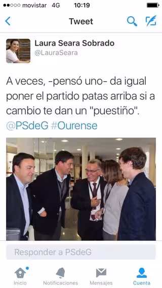 A través de un comentario en su cuenta de Twitter, Seara reflexiona acerca de que "a veces da igual poner el partido patas arriba si a cambio te dan un 'puestiño", en referencia al también presidente provincial del PSOE en Ourense.