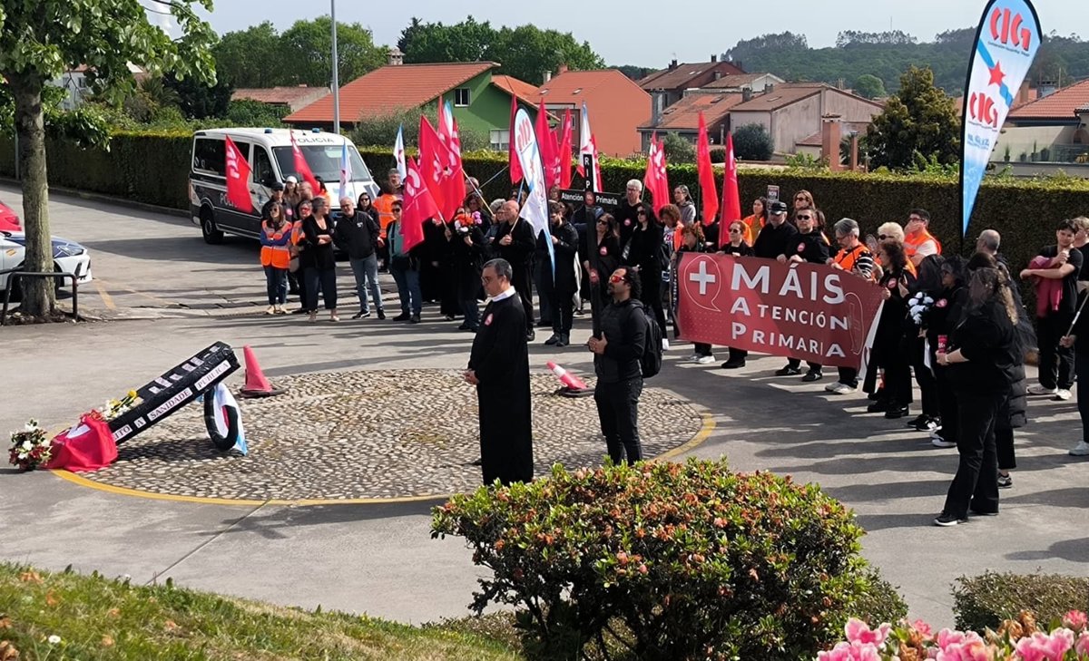 Esta misma mañana CIG-Saúde ha convocado una concentración frente a la sede de la consellería, simulando un entierro, para ilustrar la "muerte" de la atención primaria. Varias decenas de personas han participado en la concentración, con un ataúd y un cura que han representado el entierro del servicio.