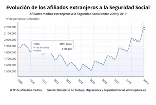 Afiliados medios extranjeros a la Seguridad Social entre 2009 y 2019 en el conjunto del Estado - EUROPA PRESS