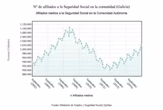 Mientras, por regímenes, 785.989 de los afiliados en Galicia se corresponden con el régimen general (753.331 en el subtipo general, 27.000 en el sector del hogar y 5.658 en el agrario), 212.910 están dados de alta como autónomos y 21.489 en el régimen del mar.