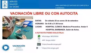 Por su parte, para vacunación libre el área compostelana habilita los hospitales Clínico en Santiago y el de O Barbanza en Ribeira de 9,00 a 21,00 horas de sábado a jueves con autocita.
