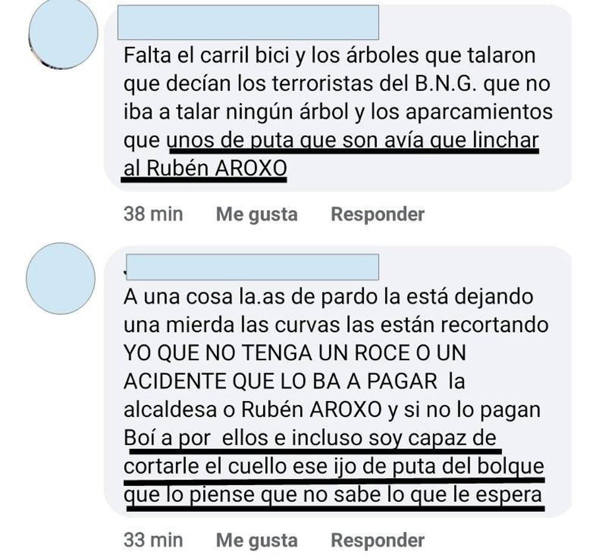 En concreto, tal y como refleja una captura de pantalla difundida por el dirigente nacionalista, se encontró en su perfil de Facebook con dos comentarios --con errores ortográficos-- como el que sigue: "Falta el carril bici y los árboles que talaron que decían los terroristas del BNG que no iba a talar ningún árbol y los aparcamientos que unos de puta que son *avía que linchar al Rubén Arroxo".