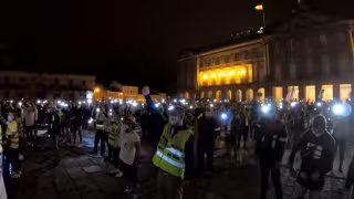 Numerosas personas, que llevaban linternas, llenaron la plaza y golpearon sus cascos contra las piedras en señal de protesta. Además, llevaron varias pancartas, una de ellas con la imagen de Santiago Apóstol pidiendo un estatuto de la energía.