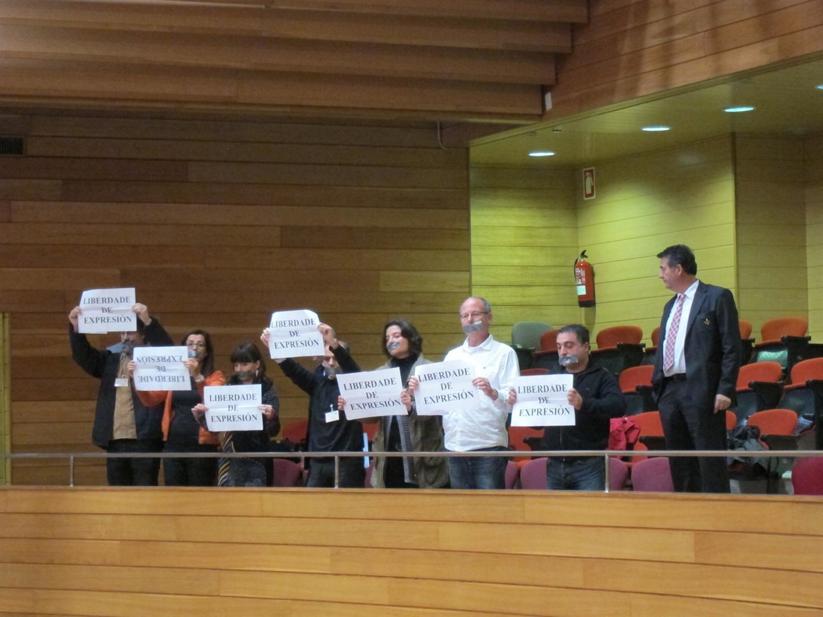 Así, un grupo de siete personas se alzaron con carteles a favor de la "libertad de expresión" con pegatinas en la boca en señal de mordaza durante una pregunta oral en el pleno formulada por la diputada nacionalista Ana Pontón, quien preguntó al conselleiro de Presidencia, Alfonso Rueda, por las "represalias" a dos profesionales después de secundar una protesta.