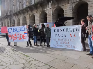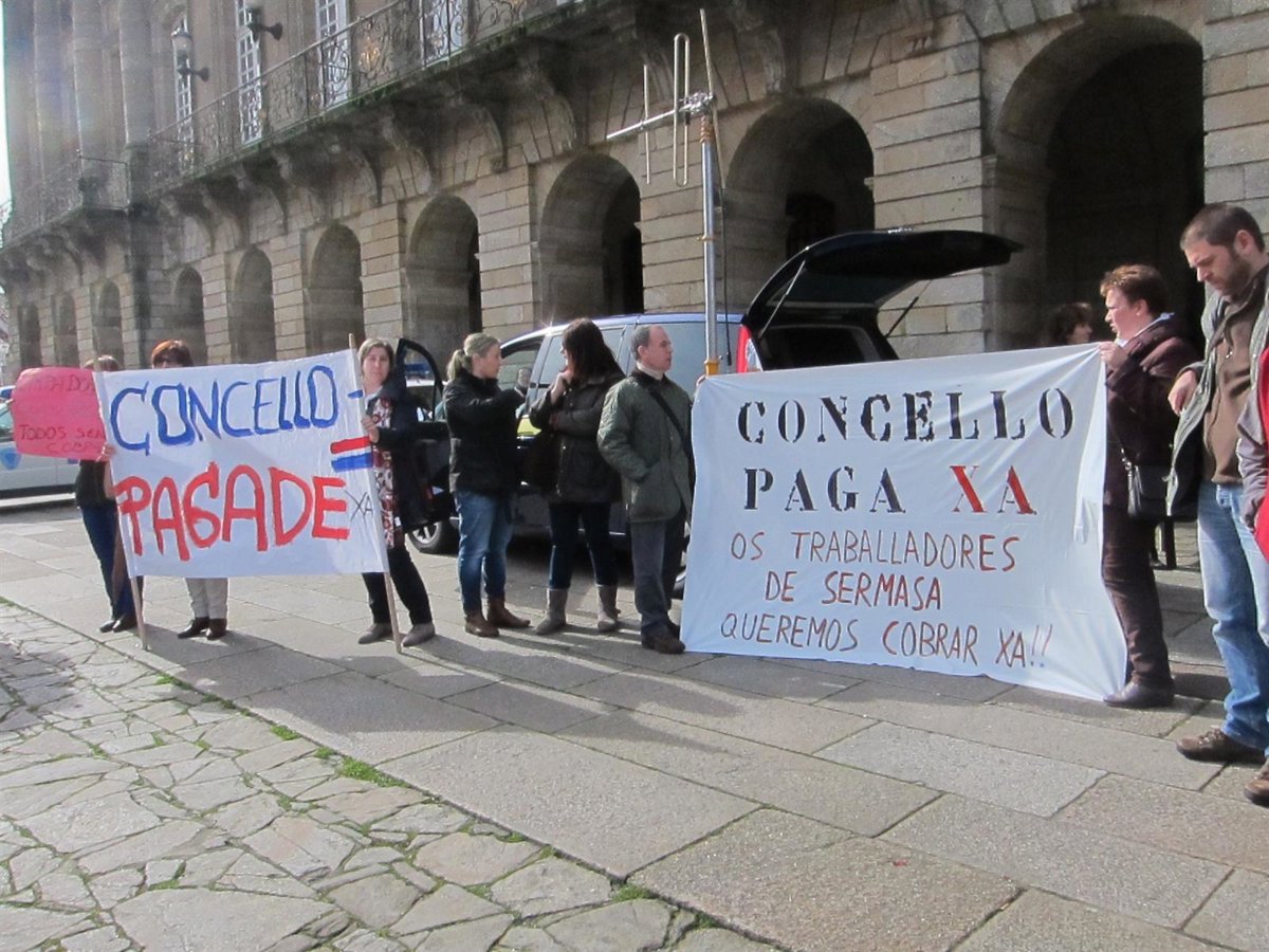 Un grupo de trabajadores de Sermasa, empresa del grupo Véndex investigada en la operación 'Pokémon', se ha concentrado este lunes a las puertas del Pazo de Raxoi, en la Praza do Obradoiro, para reclamar el cobro de las nóminas de enero.