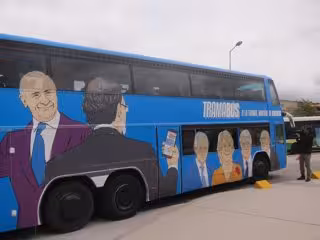 El 'Tramabús' de Podemos ha recalado este viernes en Galicia, donde ha incorporado a la luna delantera una imagen del presidente de la Xunta, Alberto Núñez Feijóo, sobre el lema 'invitado especial'.