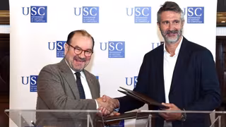 El rector de la USC, Antonio López, y el presidente de la Fegamp, Alberto Varela, firman el acuerdo - USC