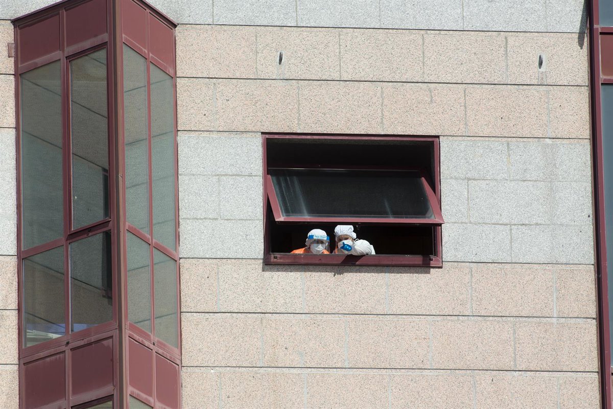 Dos trabajadores protegidos se asoman por una de las ventanas de la residencia de mayores DomusVi de Outeiro de Rei en Lugo. - Carlos Castro - Europa Press - Archivo