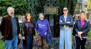 Xaquín Pastoriza (Ecoloxistas en Acción), Teresa González ( AAVV Zona Centro), Antón Lois (Amigas da Terra), Alba Novoa (AAVV Zona Centro) y María Pérez (FAVEC) denuncian la "violencia arboricida" del gobierno de Vigo. - EUROPA PRESS