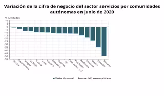 La tasa anual de la cifra de negocios del sector servicios de mercado disminuyó en el sexto mes de este año respecto a junio de 2019 en todas las comunidades autónomas, con Baleares (-49,5%), Canarias (-35,2%) y Comunidad de Madrid (-23,6%) registrando las mayores bajadas.