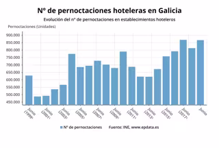 En cuanto a las pernoctaciones, a nivel gallego se registraron 866.936, 53.743 más que hace un año, lo que implica un aumento del 6,6%. Así, la estancia media disminuyó levemente, hasta 1,89 días y la ocupación se situó en el 42% de las plazas (49% en caso de los fines de semana).