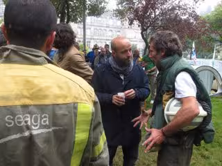 El candidato de En Marea a la Presidencia de la Xunta, Luís Villares, ha compartido desayuno en la mañana de este viernes con los trabajadores de Seaga, que desde el lunes se encuentran acampados frente a la sede de la Xunta de Galicia en Santiago.