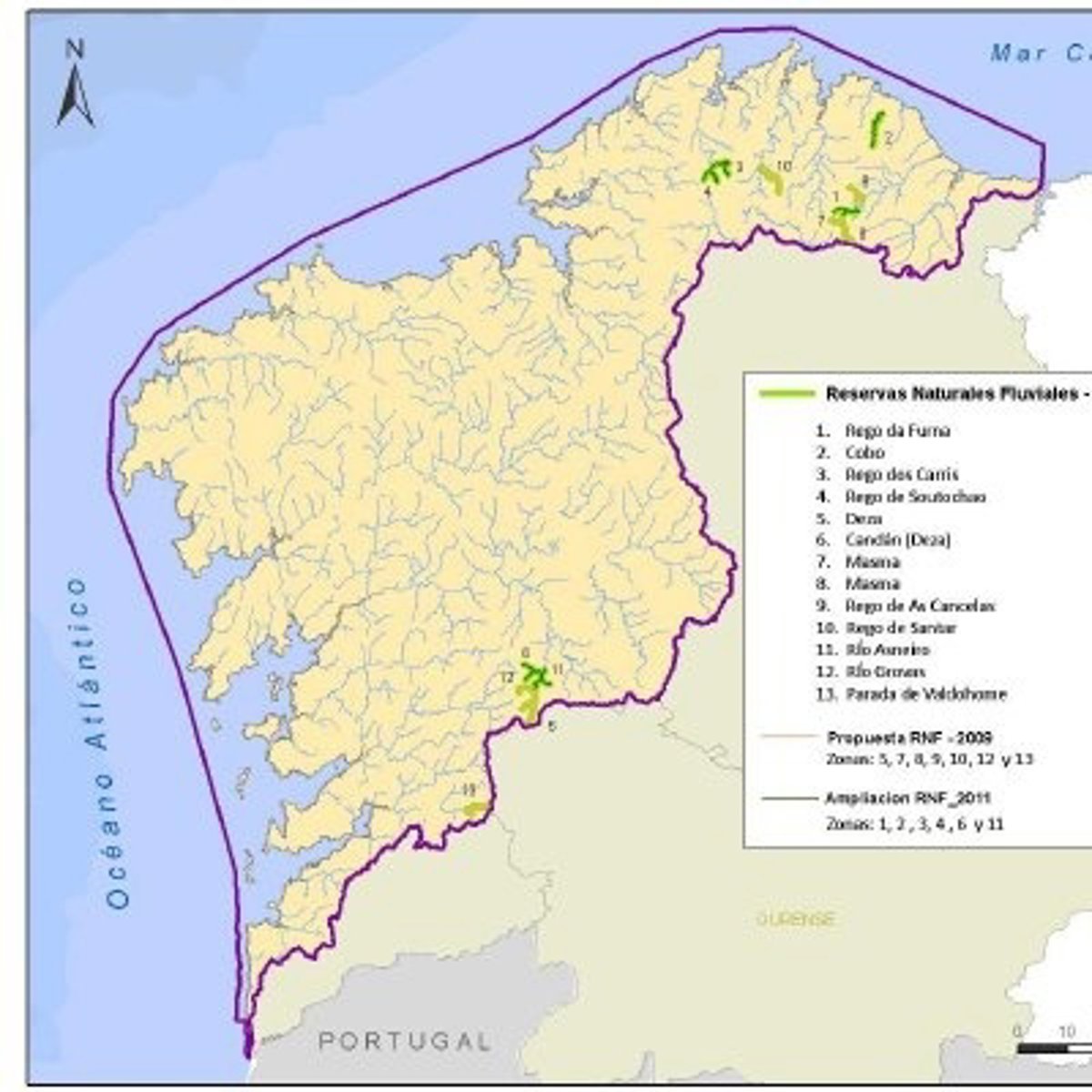 De este modo, los 13 tramos de reservas naturales fluviales serán: Rego da Furna, Cobo, Rego dos Carris, Deza, Cadán (Deza), Masma, Rego de As Cancelas, Rego de Santar, Rio Asneiro, Río Grovas y Parada de Valdohome.