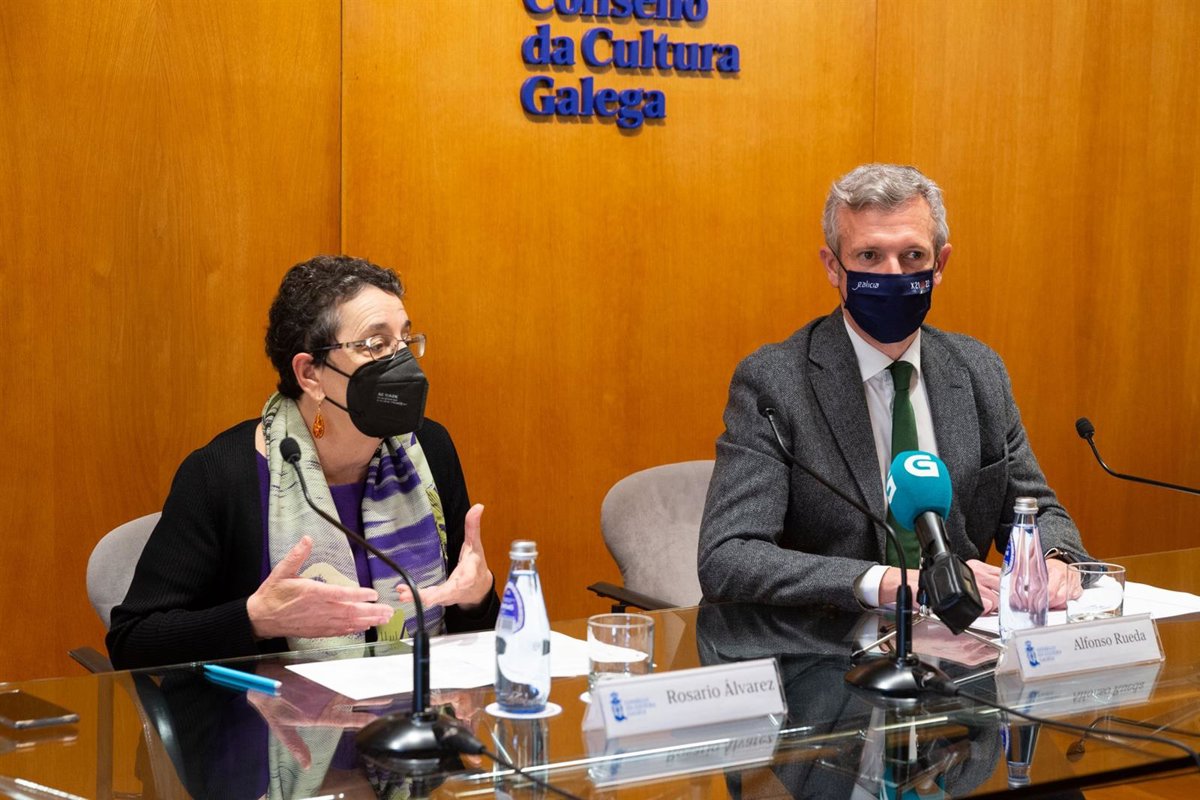 Alfonso Rueda, junto con la presidenta del Consello da Cultura Galega, Rosario Porto, inauguró este martes una jornada en la que se han convocado a agentes culturales para dar a conocer y explicar las posibilidades de la norma, la Ley 10/2021 del 9 de marzo, reguladora de la acción exterior y cooperación.