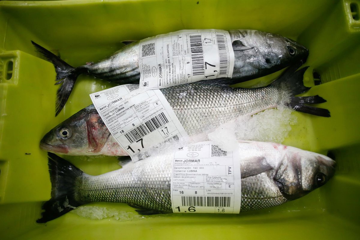 Tres lubinas en la lonja de Burela, a 19 de diciembre de 2023, en Burela, Lugo, Galicia (España). - Carlos Castro - Europa Press