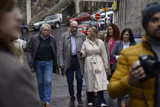La vicepresidenta del Gobierno y ministra de Trabajo, Yolanda Díaz (3i), junto con el alcalde de Barbadás, Xosé Carlos Valcárcel (2i), la teniente alcaldesa, Victoria Morenza (2d), y la concejala de Igualdad, Elisabet González (d), llegan a la conferenc - Rosa Veiga - Europa Press