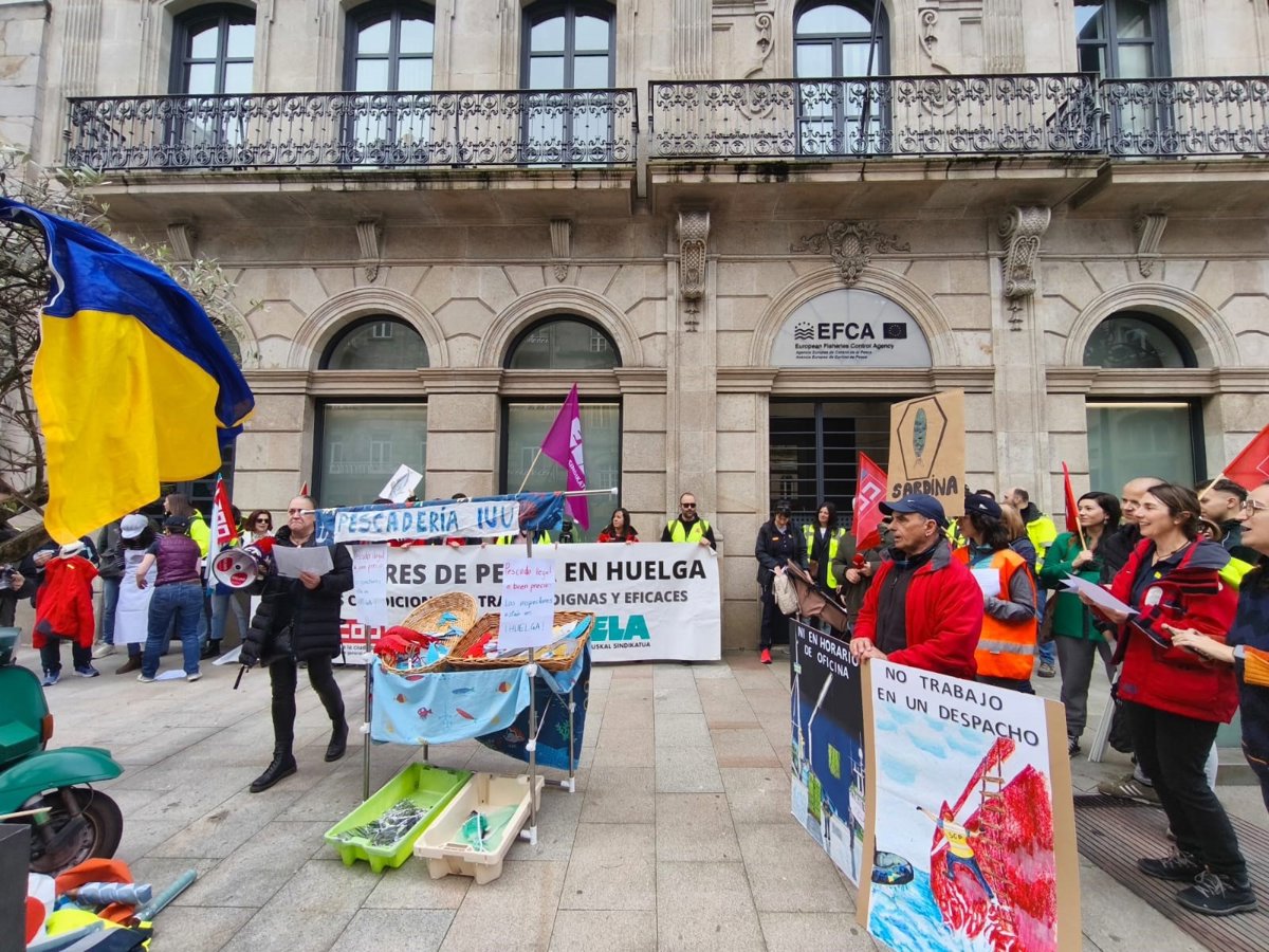 Decenas de inspectores de Pesca, que están en huelga indefinida desde hace tres días a nivel nacional (convocada por CC.OO. y ELA), se han concentrado este miércoles ante la sede de la Agencia Europea de Pesca y en el puerto de O Berbés, en Vigo, en el marco de las protestas para reclamar mejoras en sus condiciones laborales.