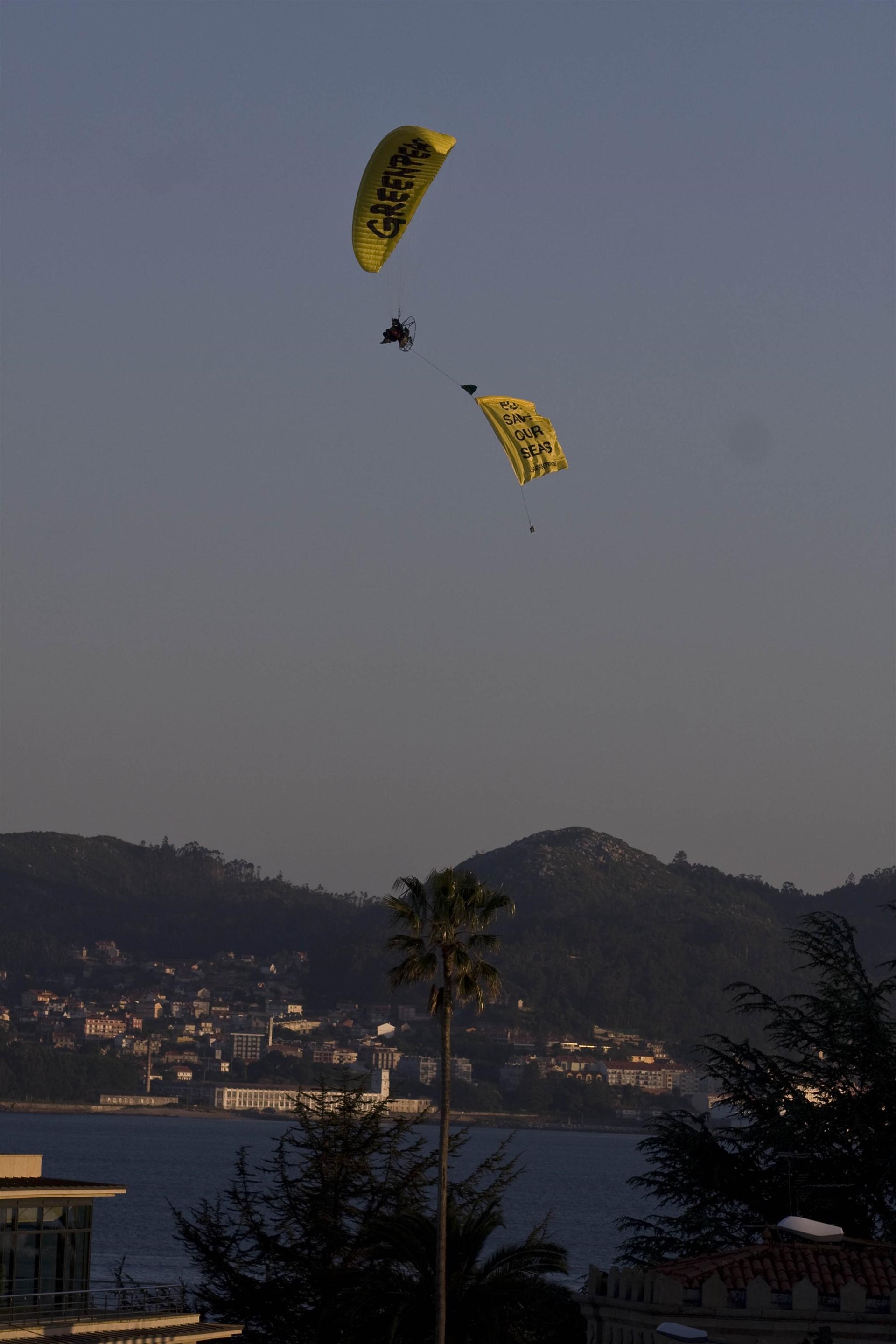 Dos activistas de Greenpeace sobrevolaron esta mañana la zona donde se celebra la reunión informal del Consejo de Ministros de Pesca de la UE, en Vigo, subidos a sendos parapentes a motor, y portando pancartas en las que pedían a las autoridades comunitarias que "salven" los mares.