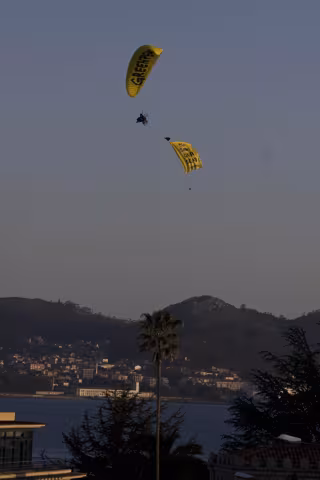 Así, los dos 'pilotos' sobrevolaron el hotel con dos parapentes amarillos con el logo de Greenpeace y dos pancartas con el lema en inglés 'UE. Save our seas' --'UE. Salvad nuestros mares'--.