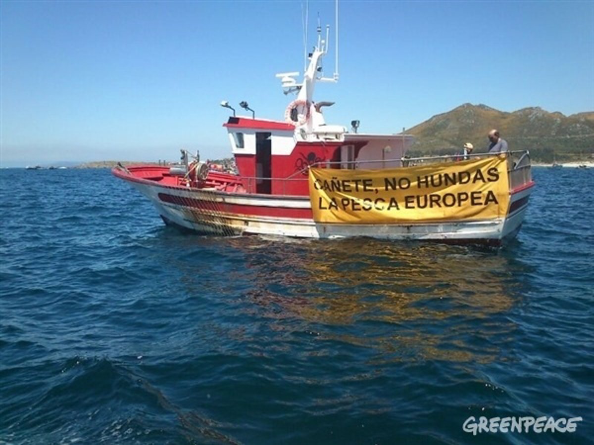 Los pescadores han salido a recibir al buque de Greenpeace con pancartas con mensajes como 'La pesca sostenible es el futuro' y 'Cañete, no hundas la pesca europea'. Esta movilización se ha producido en un momento en el que la Comisión Europea está negociando la nueva Política Pesquera Común (PPC) que regulará el sector los próximos años.