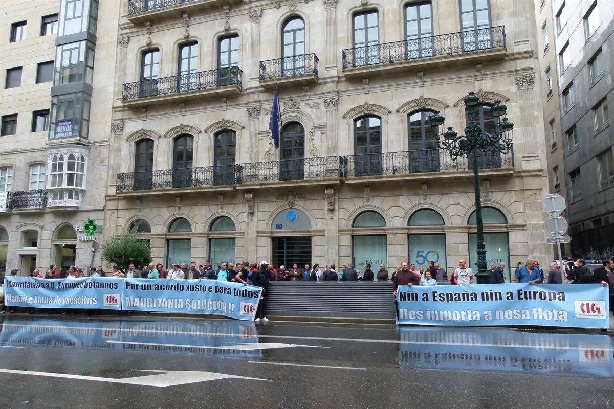 Marineros que faenaban en aguas mauritanas se han concentrado este lunes durante aproximadamente una hora delante de la Agencia Comunitaria de Control de la Pesca, en Vigo, para reclamar un nuevo acuerdo pesquero que les permita volver a faenar en aguas de ese país.
