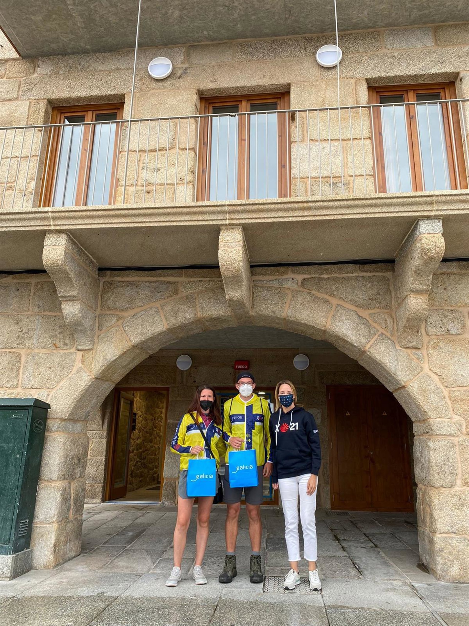 La delegada territorial de la Xunta en Vigo, Marta Fernández-Tapia, a las puertas del albergue 'Juan Manuel López-Chaves', en el Casco Vello de la ciudad olívica, con los primeros peregrinos que usaron el servicio. - XUNTA DE GALICIA
