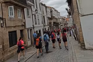 Archivo - Peregrinos bajan por el medio de la Rúa de San Pedro, en Santiago de Compostela - EUROPA PRESS - Archivo