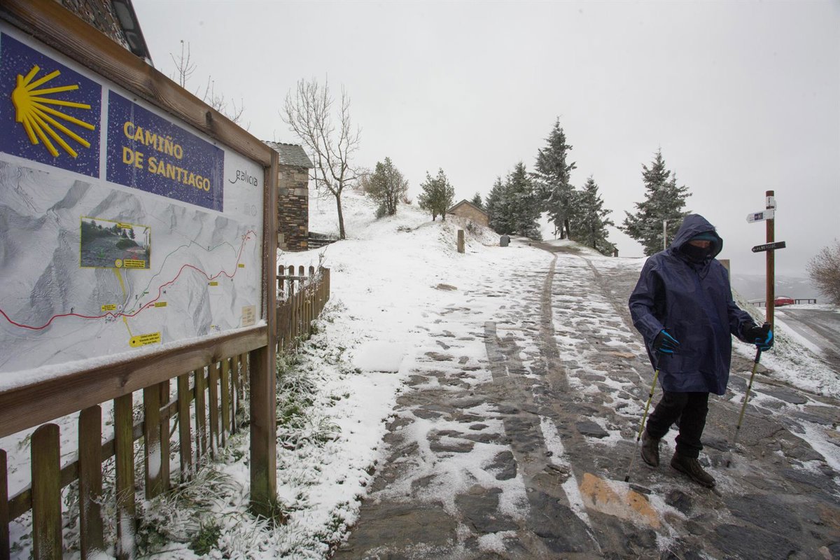 Un hombre camina por el Camino de Santiago durante la nevada del año en las montañas de Os Ancares, que ha dejado cumbres nevadas en el noroeste peninsular en cotas superiores a los 800 metros - CARLOS CASTRO - Europa Press - Archivo