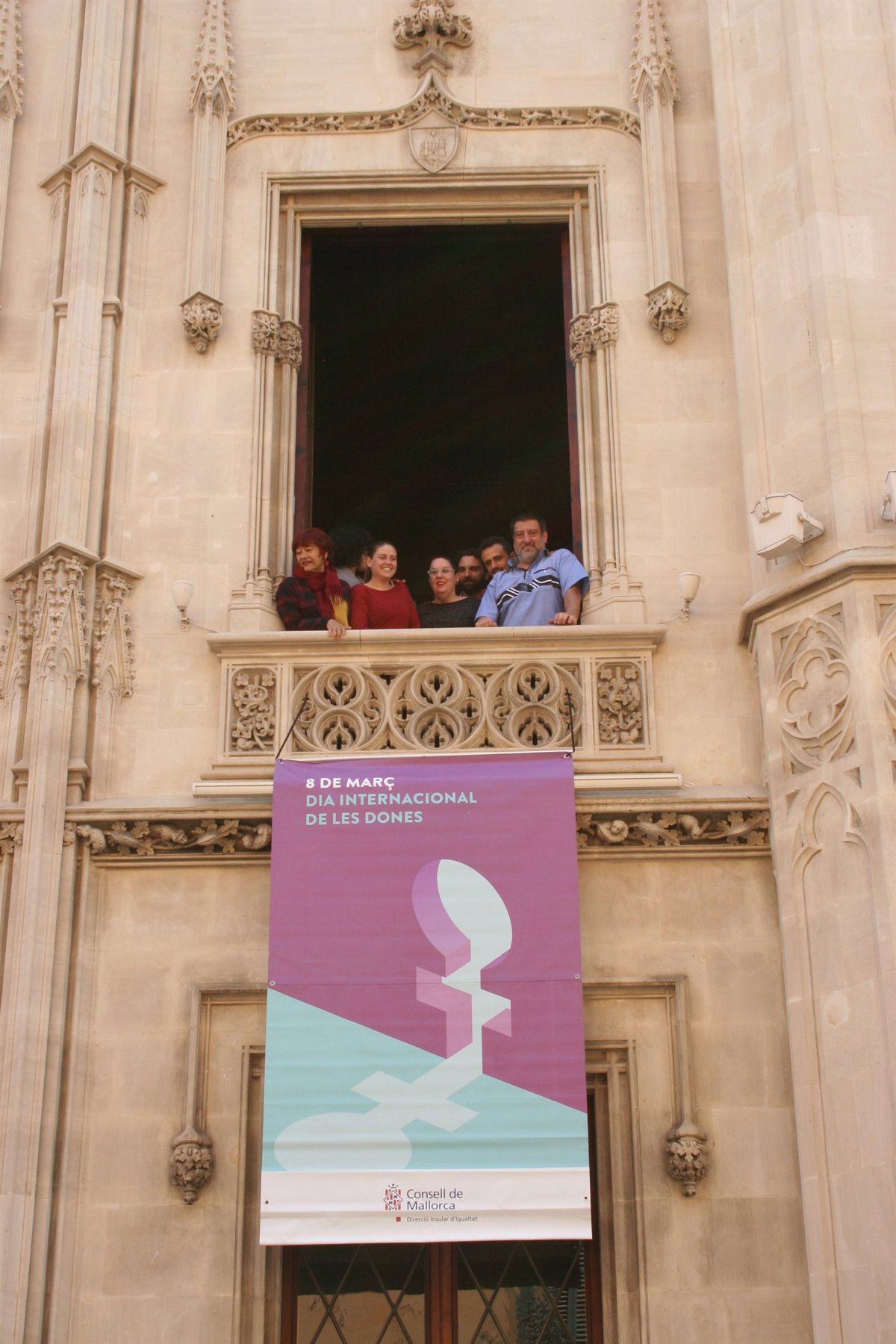 El vicepresident segon i conseller de Participació Ciutadana i Presidncia del Consell de Mallorca, Jesús Jurado, al costat de la directora insular d'Igualtat, Nina Parrón, han penjat aquest dilluns una pancarta a la faana de la seu de la institució insular en commemoració del Dia Internacional de la Dona, que se celebra divendres que ve 8 de mar.
