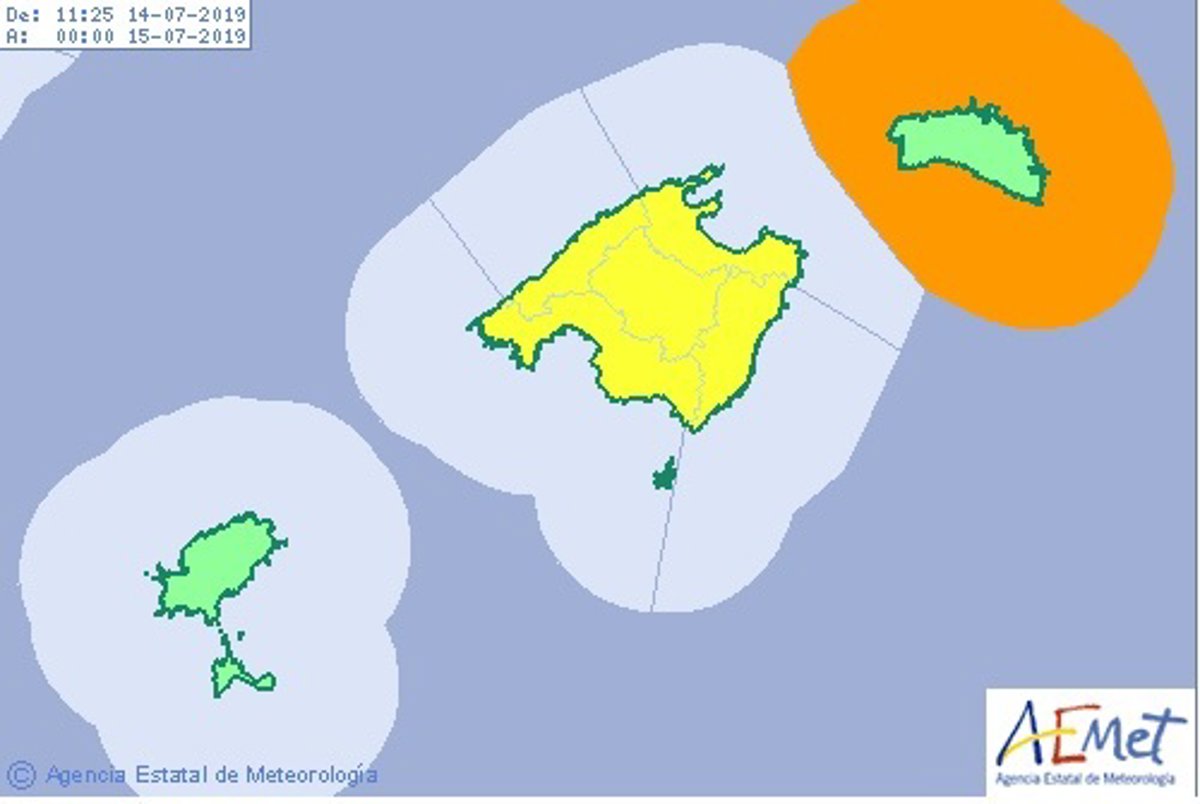 Imatge de l'alerta taronja per 'rissaga' activada a Menorca i de l'alerta groga per pluges i tormentes activada a Mallorca. - AEMET