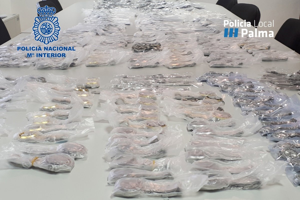 La Policia Nacional, en collaboració amb la Policia Local, ha detingut dues persones per introduir a Palma 375 rellotges d'imitació de marques conegudes amb l'objectiu de distribuir-los al mercat illegal mitjanant la venda ambulant o el 'top manta'.