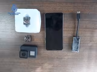 A la seva arribada, els agents de la Policia Nacional van inspeccionar al detingut i van poder interceptar un telfon mbil, un cmera de vídeo, dues cmeres de vídeo petites, targetes de memria, i altres utensilis específics per poder realitzar aquest delicte.