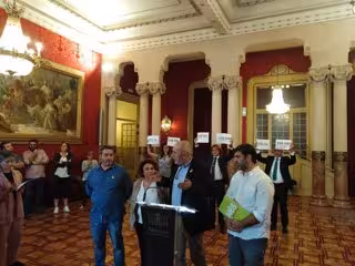 Minuts més tard, i mentre els diputats de MÉS es trobaven en l'avantsala del ple davant els mitjans de comunicació, els diputats de Vox, Sergio Rodríguez, Idoia Ribas i Jorge Campos, s'han posicionat en segona fila amb cartells en els quals es podia llegir '116 JA' i '155 JA'.
