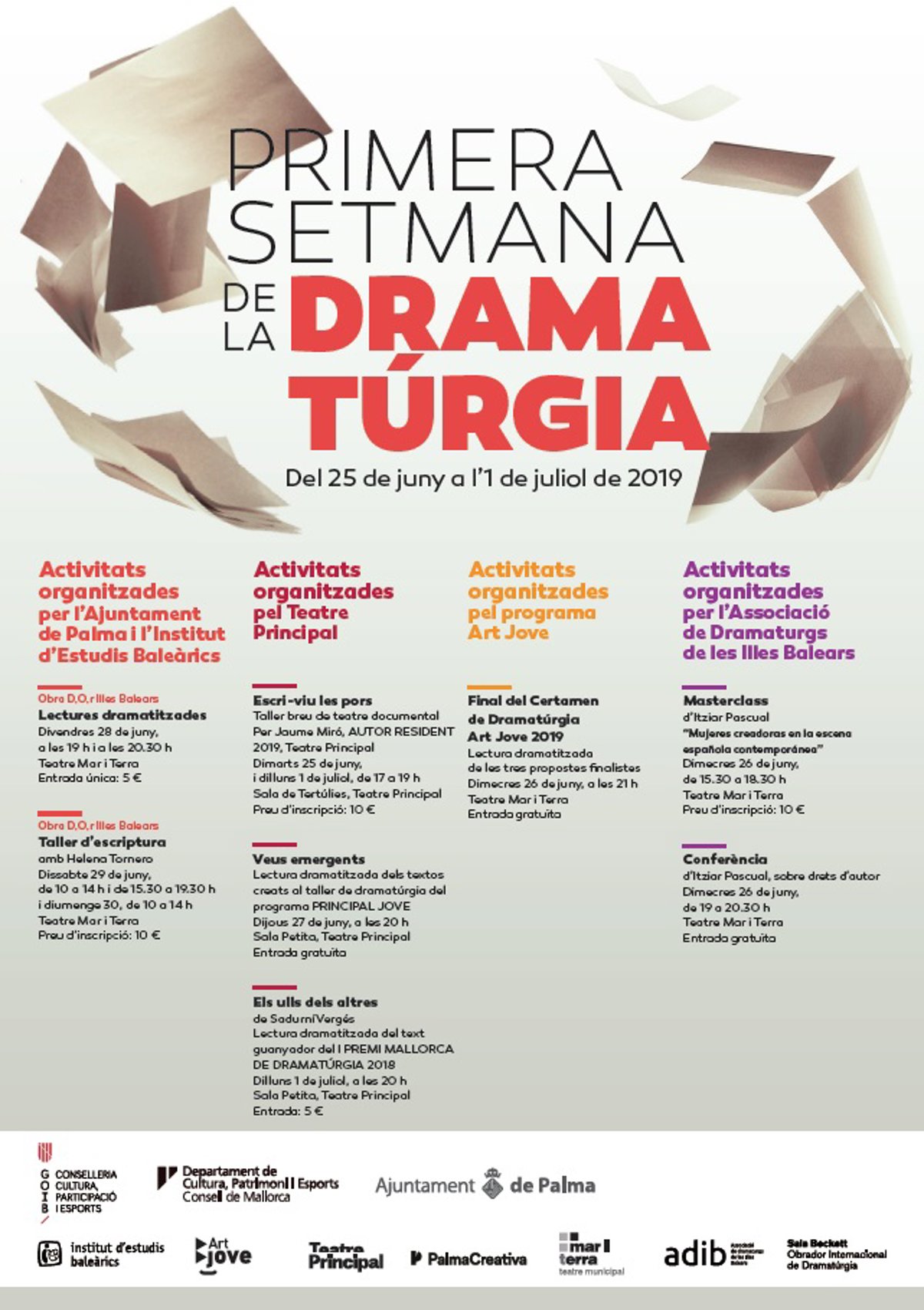 La Conselleria de Cultura, Participació i Esports, a través de l'Institut d'Estudis Balerics (IEB), participa en la Primera Setmana de la Dramatúrgia amb una convocatria de textos teatrals i un curs avanat de dramatúrgia.