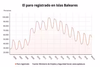 En relació a febrer, l'atur ha baixat a Balears en 3.364 persones, un 5,79%. Del total d'aturats a les Illes, 31.484 són dones i 23.277 són homes. A més, hi ha 6.890 aturats que tenen menys de 25 anys.