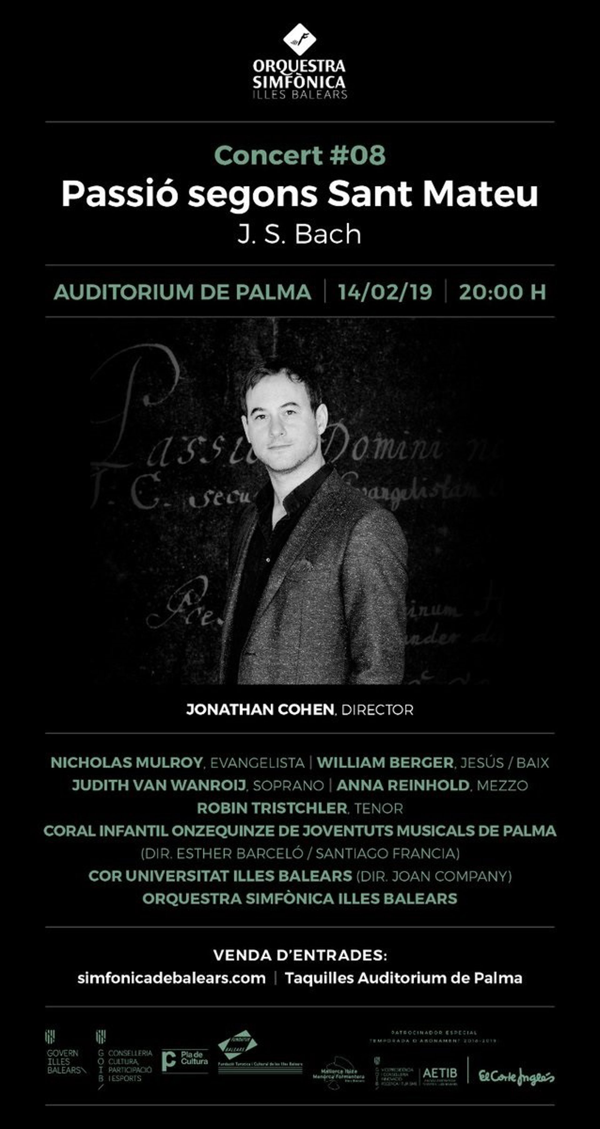 L'Auditorium de Palma acull aquest dijous l'Orquestra Simfnica de les Illes amb una interpretació de la Passió segons Sant Mateu de Bach, sota la direcció de Jonathan Cohen i amb la soprano holandesa Judith Van Wanroij.