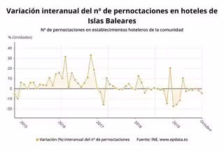 Els hotels de Balears van registrar 5,8 milions d'estades nocturnes en el mes d'octubre de 2019, la qual cosa suposa un 4,51% menys en comparació del mateix mes de l'any anterior, segons les dades de Conjuntura Turística Hotelera difosos aquest divendres per l'Institut Nacional d'Estadística (INE).