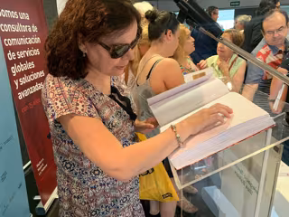 Una dona cega llegeix el llibre sobre el 'variat' mallorquí editat per l'ONZE - ONCE