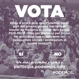 Segons ha informat la formació en un comunicat, els inscrits de la formació que hagin validat el seu document d'identitat en la plataforma participa.podemos.info, podran votar a través de la mateixa si Podem entra o no finalment a formar part del govern dels Consells insulars de Mallorca i de Menorca.