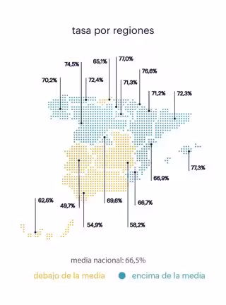 Per sobre de la mitjana nacional se situen Madrid (69,6%), Comunitat Valenciana (66,9%) i Múrcia (66,7%).