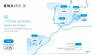 A nivell estatal, un total de 144.204 vols s'han gestionat a l'espai aeri espanyol al gener, la qual cosa suposa un 7,7 per cent més que en el mateix mes de 2018, amb 10.286 vols més que en el primer mes del passat any.