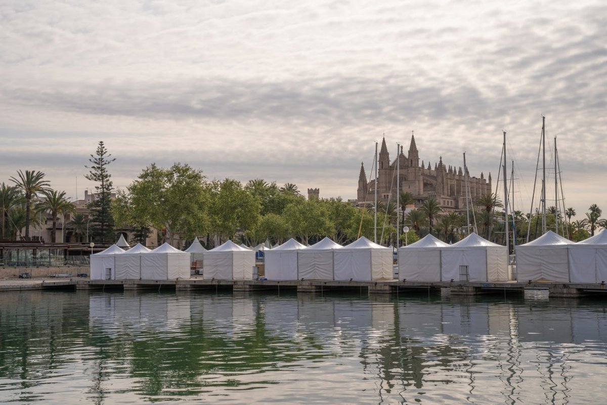 Unas 150 personas trabajan desde el pasado 11 de abril en el montaje de la próxima edición del Palma International Boat Show, que se celebrará del 28 de abril al 1 de mayo en el Moll Vell de Palma.