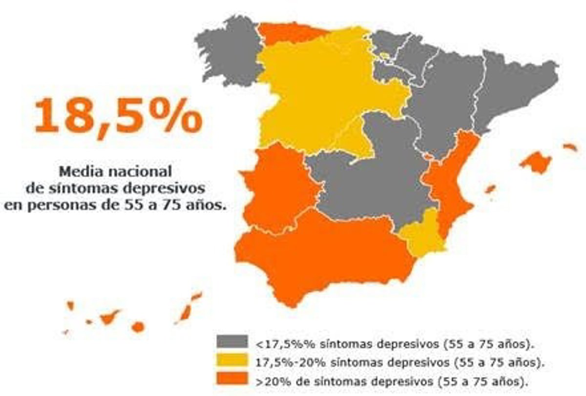 Del mismo estudio se desprende que, a nivel estatal, los síntomas depresivos son más frecuentes, en esta franja de la población, que otros problemas médicos como la falta de audición (17,3%), las jaquecas (16,5%), las dolencias coronarias (15,7%) o las respiratorias (11,4%).