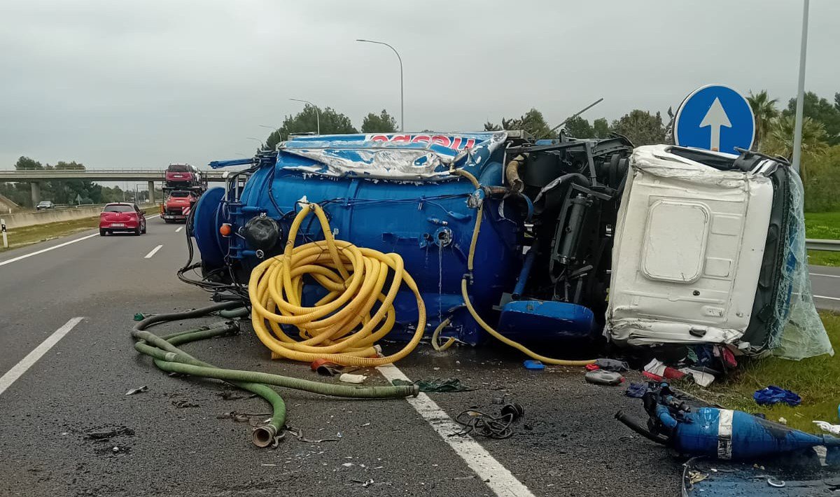 Un camión de aguas residuales ha volcado este viernes en la Ma-13 a la altura de Consell y ha provocado retenciones kilométricas hasta Santa Maria.
