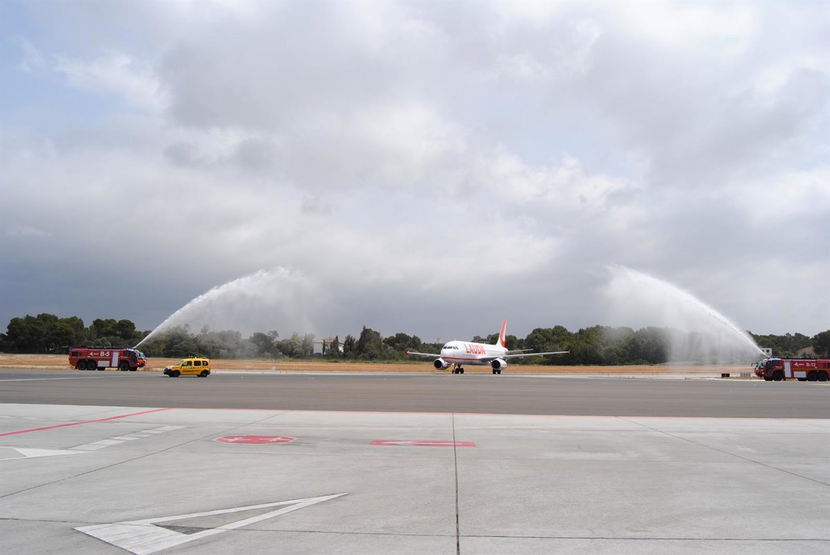 Para la inauguración, un Airbus A320 de Lauda ha aterrizado este viernes en Mallorca. Tras esto, ha sido 'bautizado' por los Bomberos.