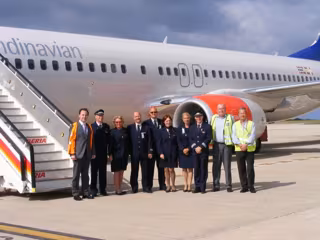 Una vez estacionada la aeronave, la tripulación del vuelo y su pasaje han sido recibidos, a pie de pista, por el jefe del gabinete de Dirección del aeropuerto, Abelardo Olives; el jefe de escala de SAS para España y Portugal, Hans Andersson; y el jefe de Unidad de Produccion de Iberia handling, Joaquín Ainsa.