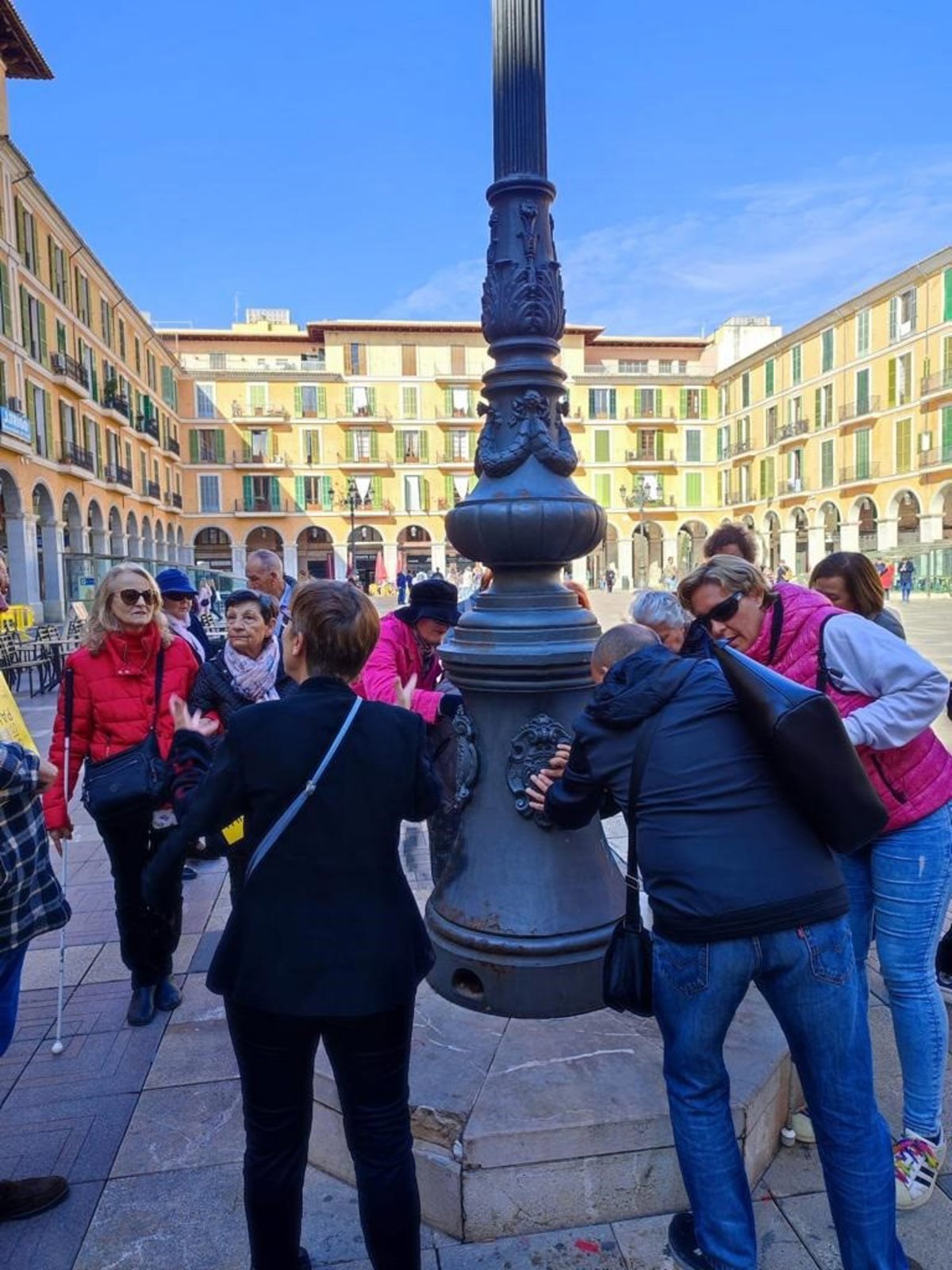 Según ha informado el Ayuntamiento de Palma en una nota de prensa, los afiliados de la ONCE han iniciado la visita en la plaza Mayor y han hecho una parada en la Mimbrería Vidal para reconocer texturas a través del tacto.
