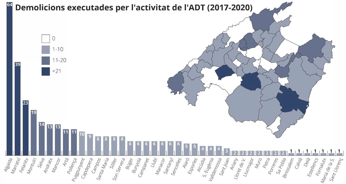 En concreto, ha habido 81 en 2017, 97 en 2018, 124 en 2019 y 44 hasta el 30 de junio de 2020. Estas 346 demoliciones se han ejecutado en la gran mayoría de municipios de Mallorca, siendo más numerosas en aquellos que tienen delegadas en la Agencia sus competencias en disciplina urbanística en suelo rústico desde su creación en 2009 y donde la actividad del ADT está más consolidada.